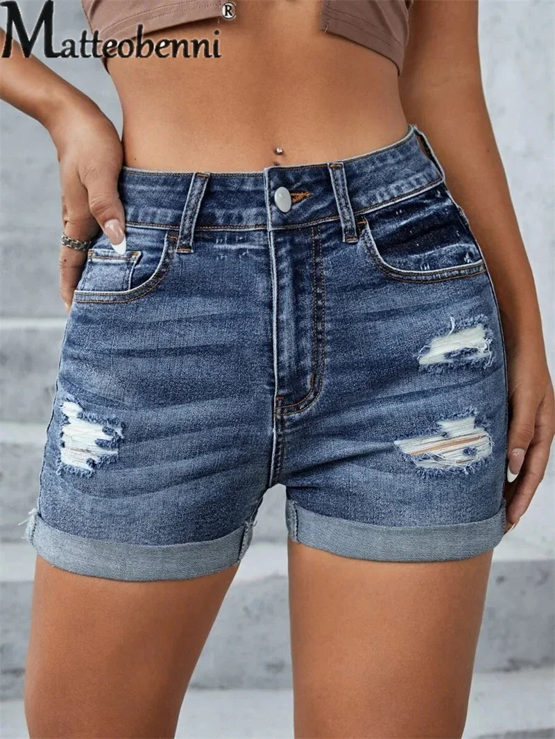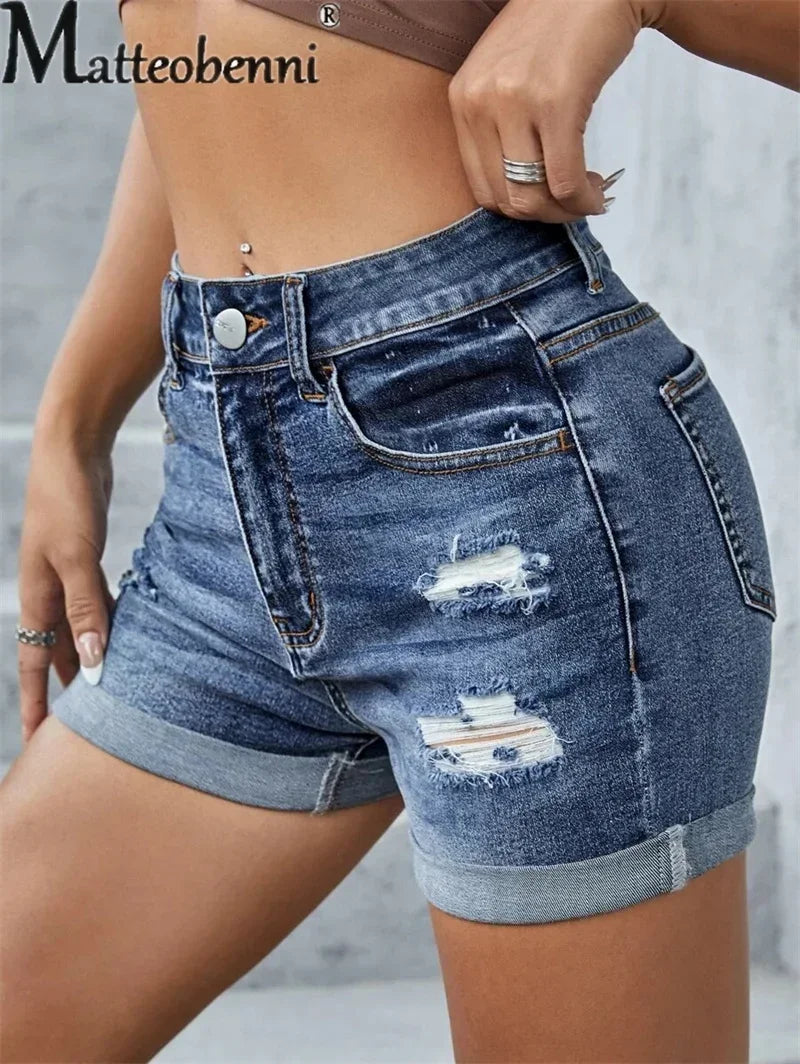 Fashion Trend Broken Holes Three Quarter Pants Summer Women's Casual Streetwear Slim Fit Button Splicing Denim Shorts Female New