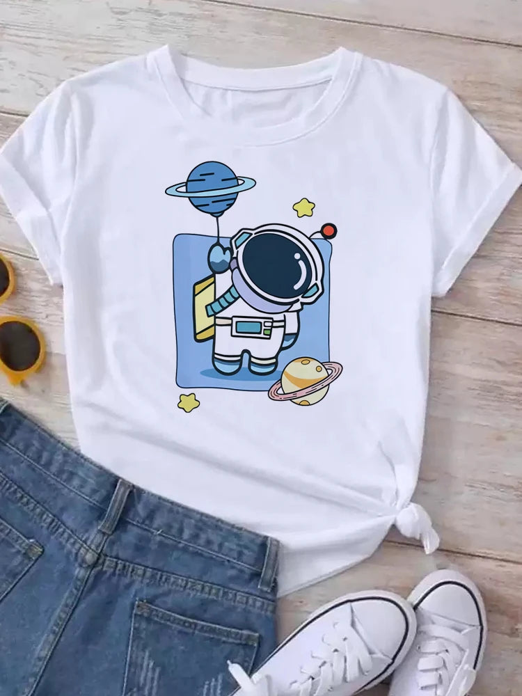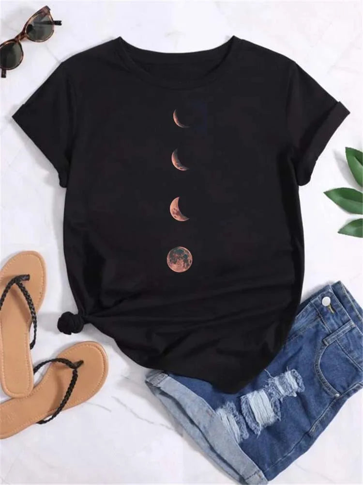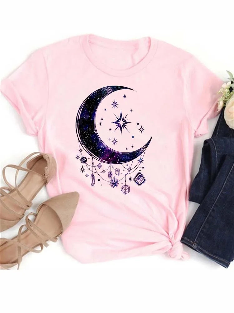 Maycaur T Shirt Women Moon Planet Print Fashion Tee Shirts Casual Round Neck Short Sleeve Streetwear Female T-Shirt Vintage Tops