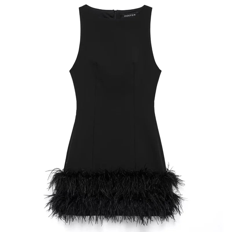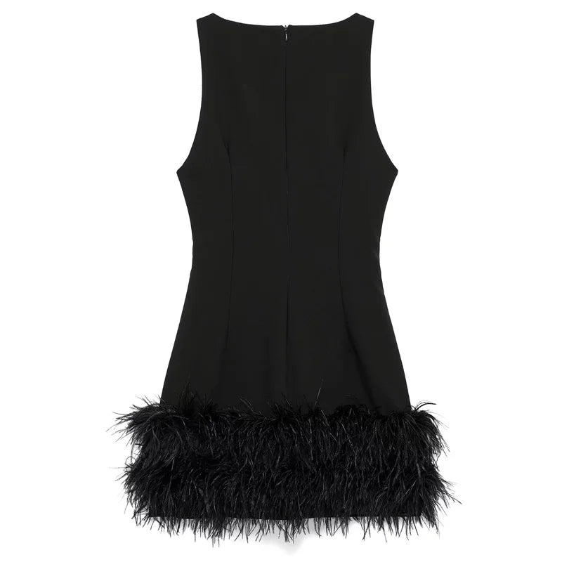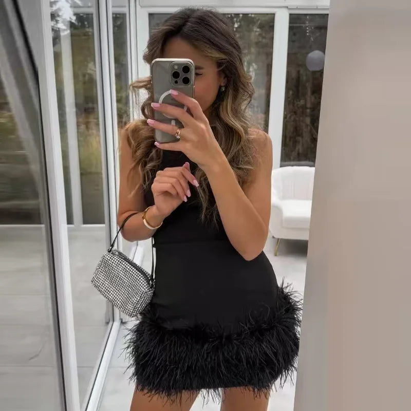 TRAF Womens Dresses Feather Black Dresses Women Sleeveless Short Dresses Female Solid Slim Spandex Sexy Dress Christmas Vestidos