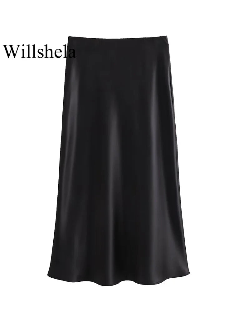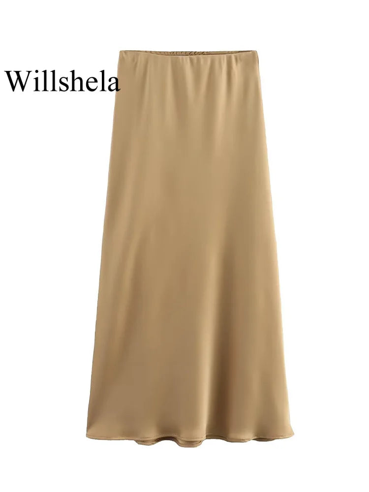 Willshela Women Fashion Satin Solid Pleated Midi Skirt Vintage Mid Elastic Waist Female Chic Lady Skirts